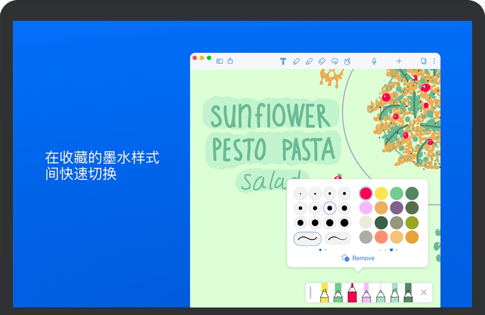 •通过收藏工具栏在墨水和橡皮擦样式之间快速切换。