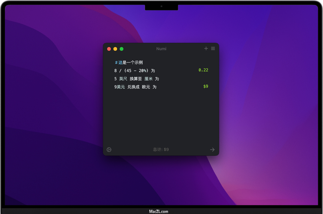Numi for Mac 是一款菜单栏计算器。使用Numi,您可以快速的进行计算,它和传统的计算器不一样的地方在于,它更加灵活,纯键盘文字输入,除了拥有传统计算器的功能外,还支持单位转换、货币换算、百分比、变量、常量、CSS计算、SI前缀、长度计算、面积计算、体积计算、温度转换、重量计算、角度、平均、格式化等等功能。