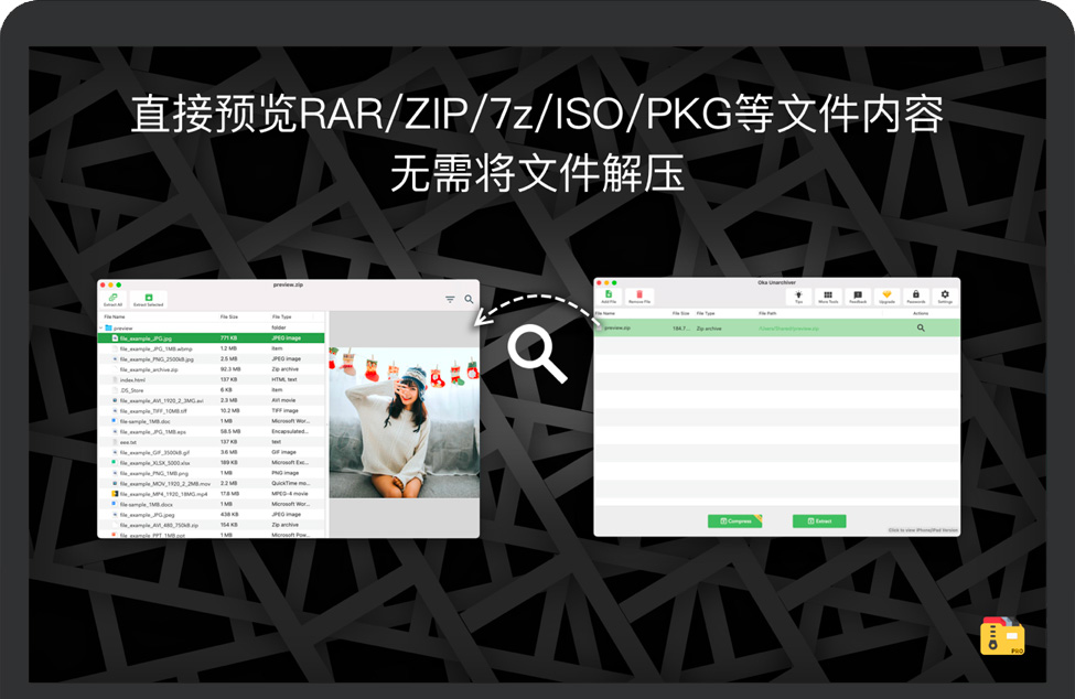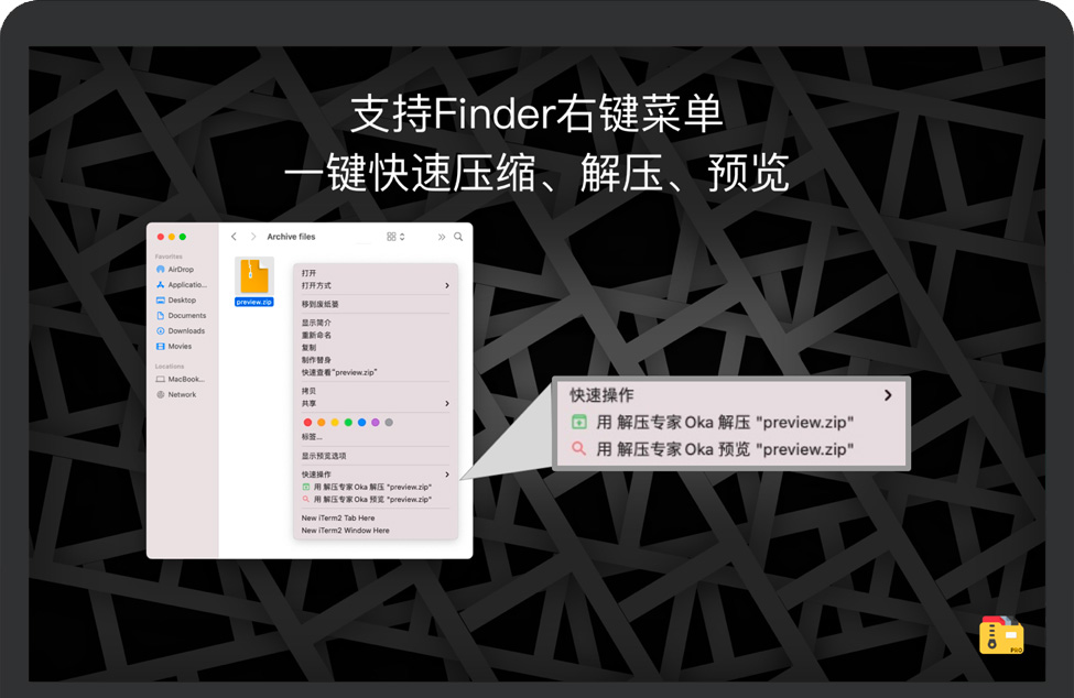 最新支持Finder扩展,直接在访达中右键点击文件,即可通过菜单进行压缩或解压缩或预览文件操作,大大简化了的操作步骤。