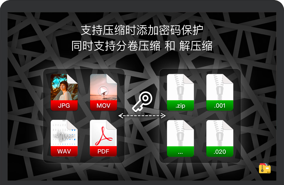 此外,解压专家 for Mac可以提取大量压缩文件,从ZIP到7Z文件,甚至是分卷文件。只需将文件拖放到图标或主窗口中,然后使用解压专家 for Mac将其解压缩。