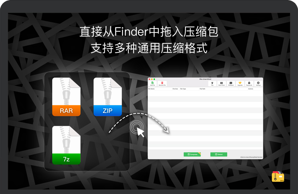 您可以将任何文件添加到列表中以进行压缩或解压。如果单击“压缩”按钮,解压大师可以一次性压缩列表中的所有选中的文件。如果单击“解压”按钮,解压专家 for Mac将自动解压文件。