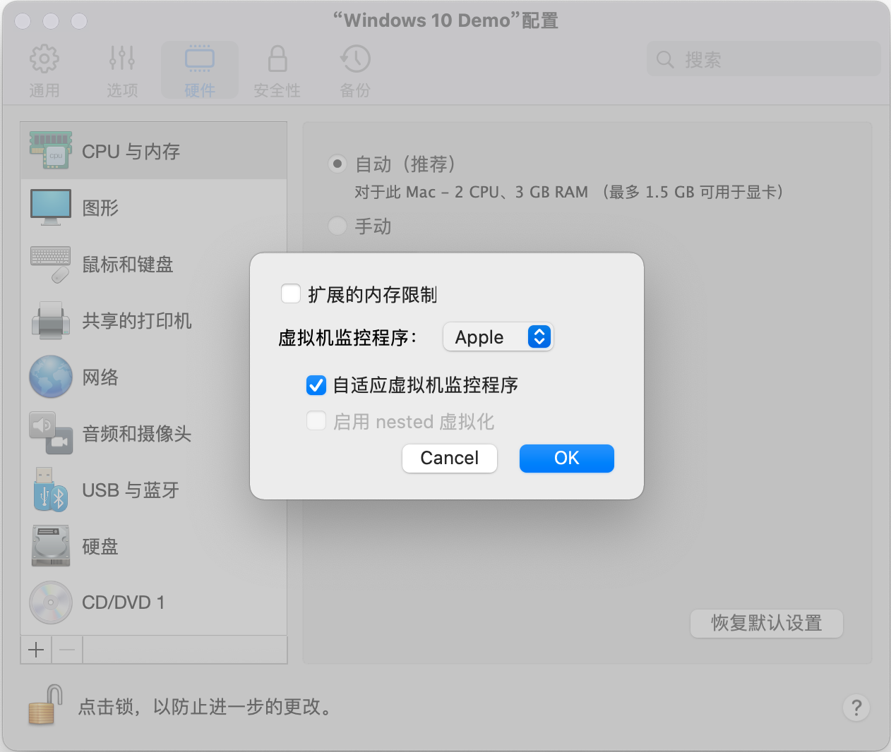补充说明:除了在安装新虚拟机时勾选安装前设定的选项可以进入以上界面更改选项之外,还可以在顶部菜单栏中选择操作 → 配置进入。如果通过以上步骤仍然无法解决问题,请提交工单或评论区留言告知,感谢您对Mac助理的支持。