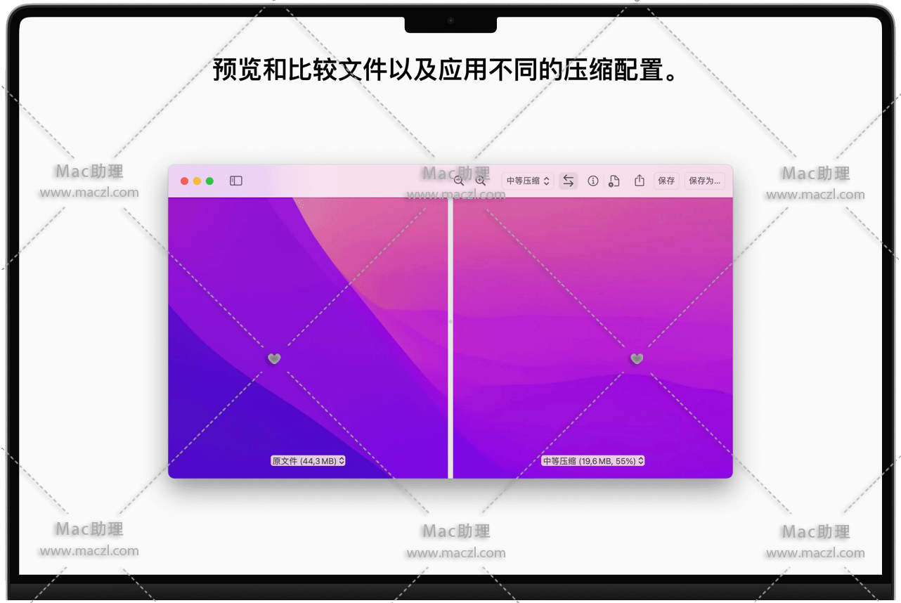 轻松比较文件和不同的压缩设置。这样,您可以确保获取的文件没有视觉质量损失或视觉损失最小。