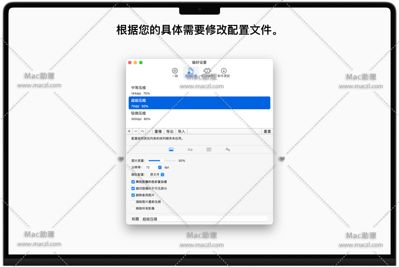 从预定义的压缩配置文件中进行选择,或者创建自己的压缩配置文件并导出并与朋友和同事共享。