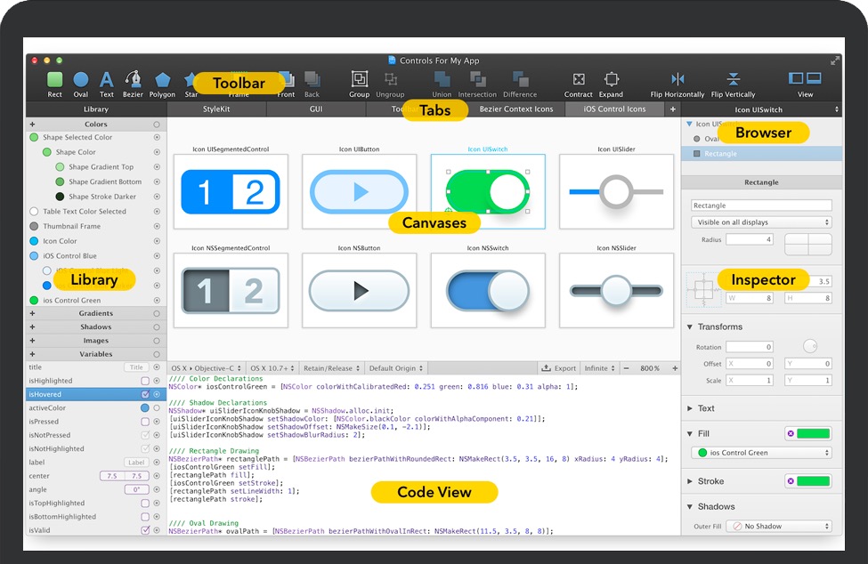 PaintCode for Mac 是一款矢量绘图应用程序,可将您的绘图实时转换为 Objective-C、Swift 或 C# 绘图代码。应用程序窗口分为多个部分,让您可以快速轻松地访问所需的一切。