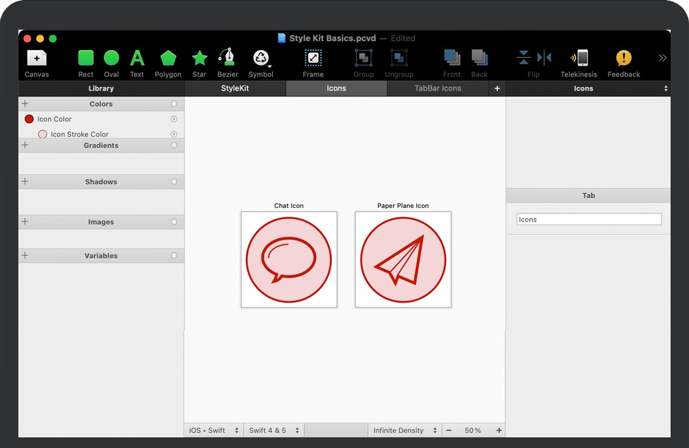 您所有的 PaintCode 绘图都导出到一个名为 StyleKit 的代码文件中。随时重新导出 StyleKit 并在您的应用中查看所有更新的绘图。