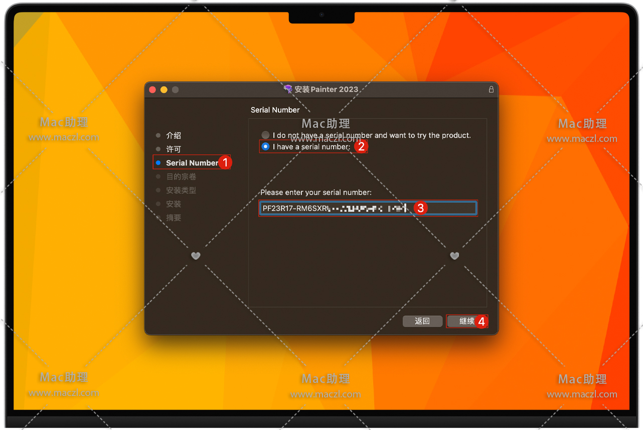 安装到“Serial Number”那一步时,如下图,选择“I have a serial number”,然后打开软件包中的第二个文件,里面有 5 组序列号,任选一组,复制粘贴上之后点击“继续”按钮安装Corel Painter。