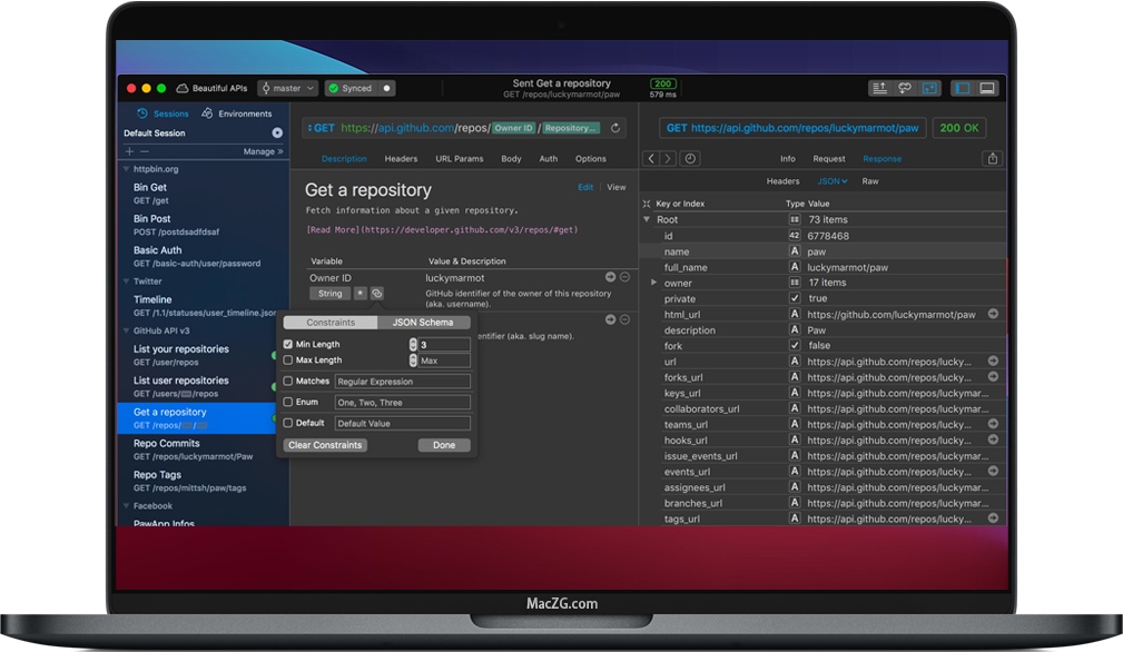 直观地构建您的API请求,并通过文本描述,类型和约束描述每个参数。Paw本机支持JSON Schema,并且可以导入并生成完全兼容的Swagger,RAML和API蓝图描述文件。