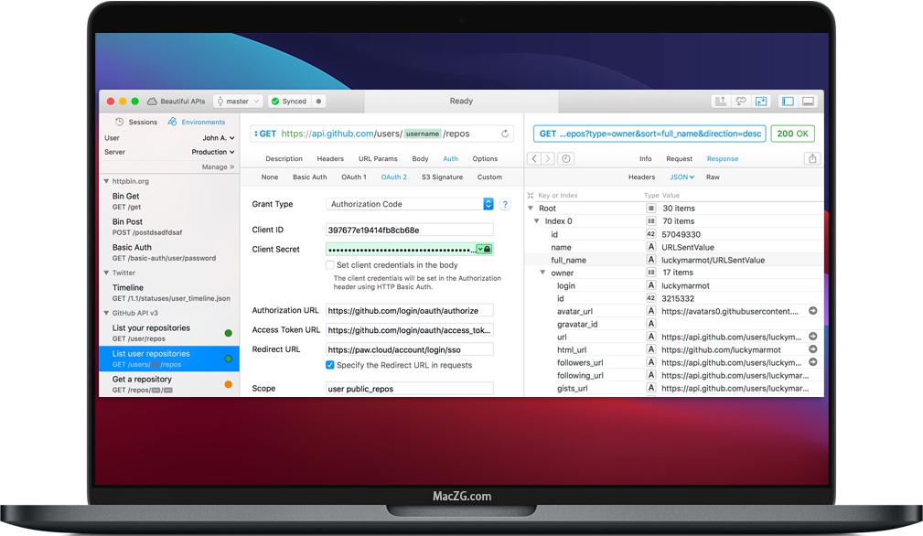 Paw for Mac 是一款运行于macOS平台的功能齐全的HTTP客户端(API接口调试工具),让您测试和描述您构建或使用的API。它具有漂亮的本机macOS界面,可组成请求,检查服务器响应,生成客户端代码并导出API定义。