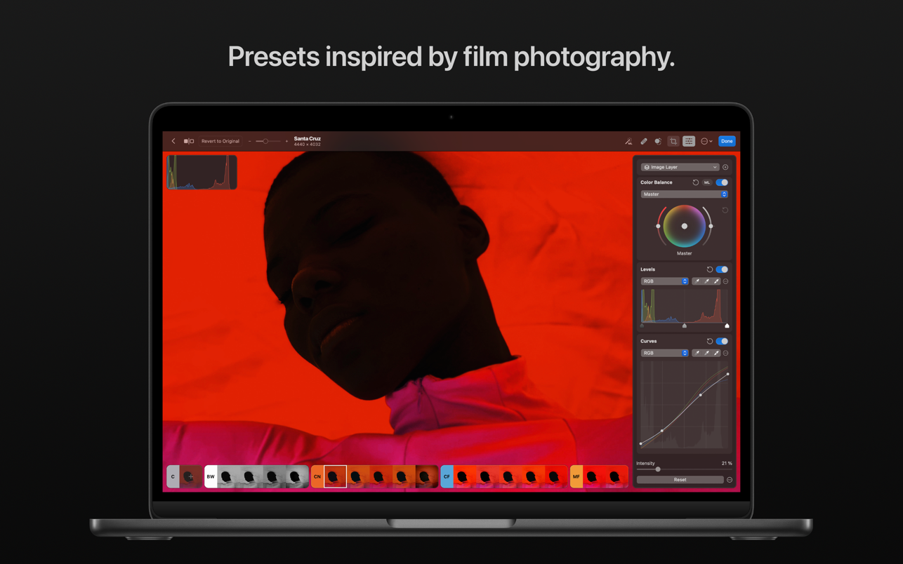 Photomator 是专为 Mac,、iPhone 和 iPad 打造的软件。 它采用了 Metal、Core ML 以及 Core Image 等强大的 Apple 技术,使其即使在编辑大型 RAW 照片或同时批量编辑多张图片时,也能展现惊人的处理速度。
