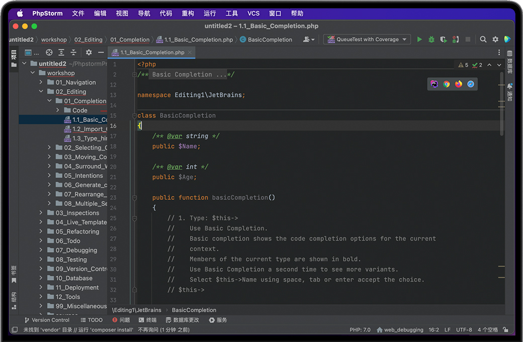 智能代码辅助功能PhpStorm 是一个能够真正“解析”您的代码的 PHP IDE。 它支持 PHP 5.3-8.1,提供实时错误预防、最佳自动补全与代码重构、零配置调试,以及扩展的 HTML、CSS 和 JavaScript 编辑器。 智能PHP代码编辑器IDE 提供智能代码补全、语法高亮显示、扩展的代码格式化配置、实时错误检查、代码折叠,并支持语音混合等。 自动重构能够小心地处理您的代码,有助于轻松且安全地进行全局项目设置。 代码质量分析成百上千个代码检查会在您输入时验证代码并检查整个项目是否存在可能的错误或代码异味。 适用于大多数检查的快速修复能够轻松地立即修复或改进代码。 Alt+Enter可为每个检查显示合适的选项。 代码导航和搜索PhpStorm 可以帮助您在处理大型项目时提高编码效率,并节省时间。 只需点击一次或搜索用法,即可跳到方法、函数或变量定义。 调试、测试和性能分析PhpStorm 为调试、测试和分析应用程序提供了强大的内置工具。 调试零配置调试让您能够轻而易举地调试 PHP 应用程序。 另外,PhpStorm 提供多个选项,可以利用可视化调试器调试您的 PHP 代码,这样您就可以:检查变量和用户定义的监视、设置断点和在运行时评估表达式、调试远程应用程序、在多个会话中同时调试页面等。 测试您可以直接在 PhpStorm 中开发 PHPUnit 测试,并利用上下文菜单选项从目录、文件或类中直接运行它们。 PHPUnit 的代码覆盖率可以显示测试会覆盖多少代码。 性能分析您可以使用 Xdebug 或 Zend Debugger 分析应用程序并在 PhpStorm 中检查聚合的报告。 HTML/CSS/JavaScript编辑器PhpStorm 包含 WebStorm 与 HTML、CSS 和JavaScript 有关的所有功能。 HTML和CSS编辑器支持所有尖端的 Web 开发技术,包括 HTML5、CSS、 SASS、SCSS、 LESS、CoffeeScript、ECMAScript Harmony 和 Jade 模板等。 Live Edit 让您可以在浏览器中立即查看所有变更,而无需刷新页面。 JavaScript 编辑器最智能的 JavaScript 编辑器与 IDE 捆绑,提供代码补全、验证和快速修复、重构、JSDoc 类型注释支持、JavaScript 调试和单元测试,以及对 JavaScript 框架的支持等。 新技术PhpStorm 为使用新语言(如 TypeScript、CoffeeScript 和 Dart)的整个开发周期提供了简化的体验。 开发环境PhpStorm 建立在开源 IntelliJ 平台之上,过去 15 年以来,JetBrains 一直在不断发展和完善这个平台。 这个平台可以针对您的开发工作流进行微调并且能够提供高度可定制的体验。 VCSPhpStorm 以统一的 UI 处理多种流行的版本控制系统,确保在 git、GitHub、SVN、Mercurial 和 Perforce 之间提供一致的用户体验。 数据库和SQLPhpStorm 为在您的项目中处理数据库和 SQL 提供了工具和编码辅助功能。 连接到数据库,编辑架构和表格数据,运行查询,甚至利用 UML 图表分析架构。 SQL 代码可以注入其他语言,或者在具有语法高亮显示、智能代码补全、实时代码分析、代码格式化和导航等功能的 SQL 编辑器中编辑。 其他功能从 IDE 执行多个常规任务,支持 Vagrant、Docker 和 Composer 等。 |