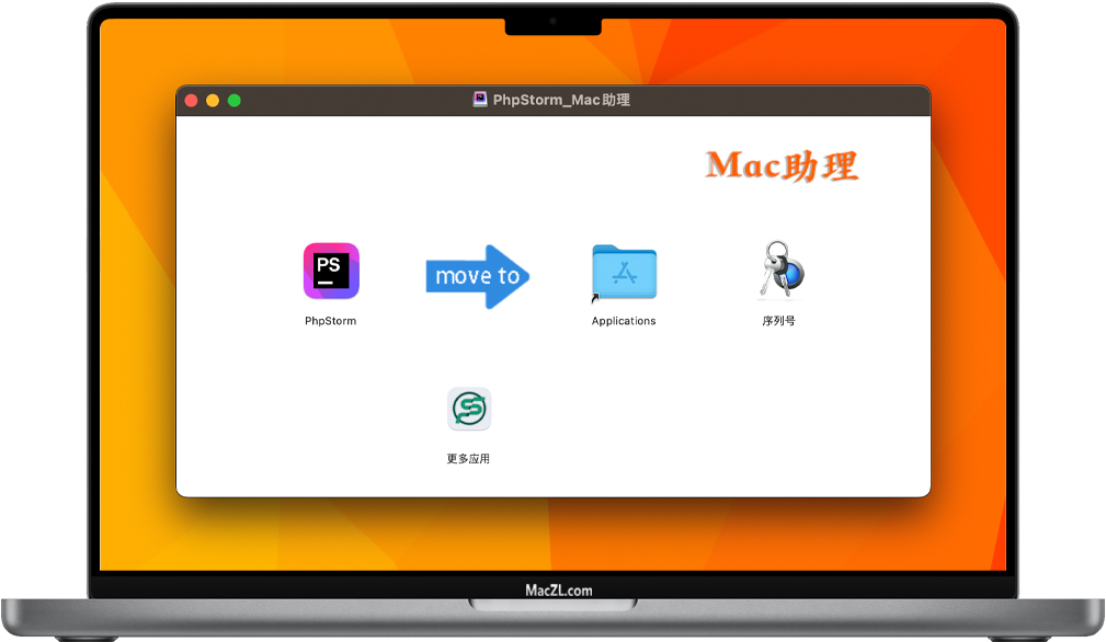PhpStorm下载完成后,打开软件包如上图,请参照JetBrains Mac 全家桶激活及汉化教程进行安装即可。