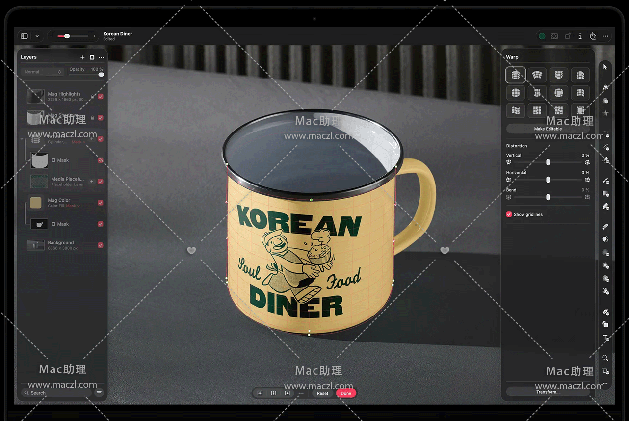 • 通过 12 个智能变形预置自动将图层变形为柱形、拱形、旗帜等常见形状,或者快速将图层分割为 3×3、4×4 或 5×5 变形网格