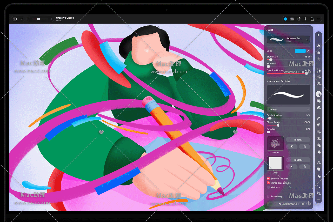 • 充分利用 iPad 上对 Apple Pencil 以及 Mac 上对绘图板的全面支持,进行压力和倾斜感应绘图