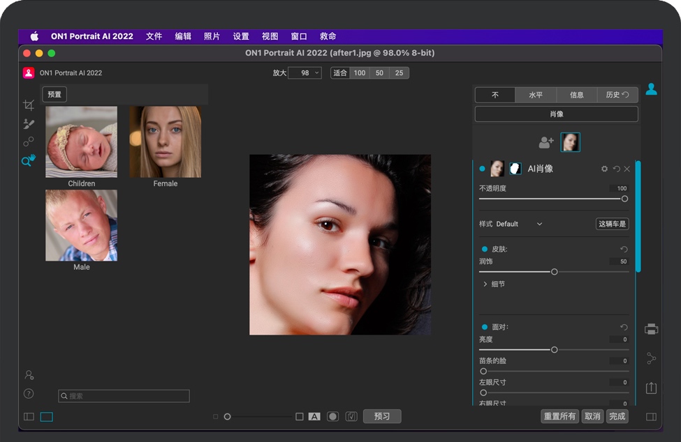 ON1 Portrait AI 2022 for Mac 是一款人像处理类软件。它既可以作为独立应用程序使用,也可以作为Adobe、Capture One、Affinity和Corel PSP的插件使用。使用 ON1 Portrait AI 只需点击一下即可完美修饰。它使用机器学习来查找照片中的每一张脸,并自动使它们看起来很棒。它会分析每张脸,并对皮肤、眼睛和嘴巴进行适量的修饰,立即为您提供专业的效果。