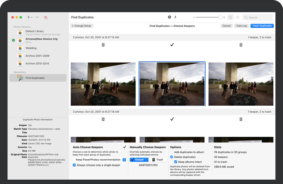 随着时间的推移,很容易将同一张照片的多个副本混入您的照片集。使用 PowerPhotos 在一个或多个库中查找重复的照片,并排查看它们,并将它们分成相册,您可以在其中轻松地将它们从库中删除。