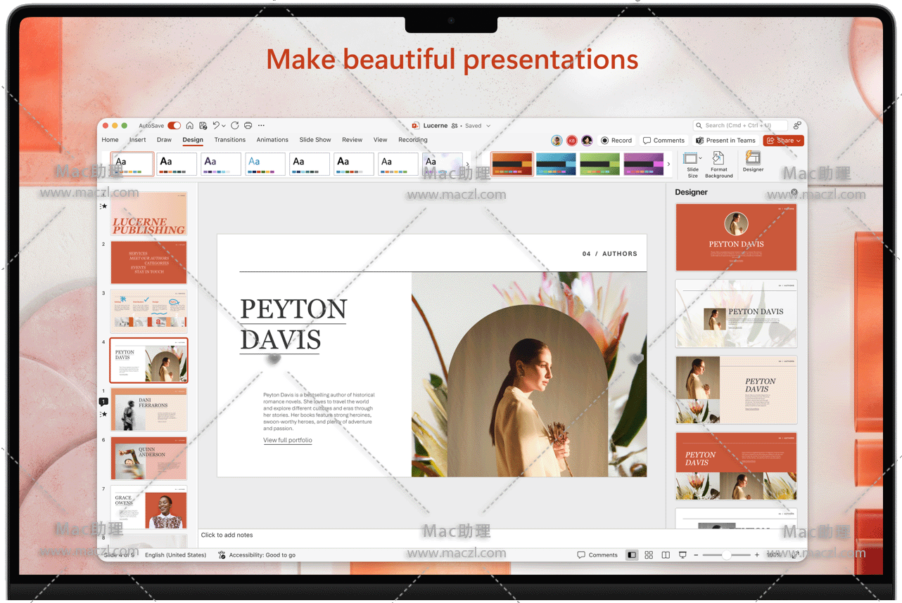 使用 PowerPoint for Mac 创建、编辑、协作处理和共享演示文稿。现在,在不同设备上以及与他人协作创建、编辑和共享演示文稿比以往任何时候都要容易。在文档中共享文件并实时协作,或编辑附加到电子邮件的 文档。Word、Excel 和 PowerPoint 中发布智能辅助功能后,你能立即获取这些功能,从而确保始终使用最新功能。无论你需要展示学校项目、商业计划还是家庭度假照片,PowerPoint 都是用于演示的首选应用。