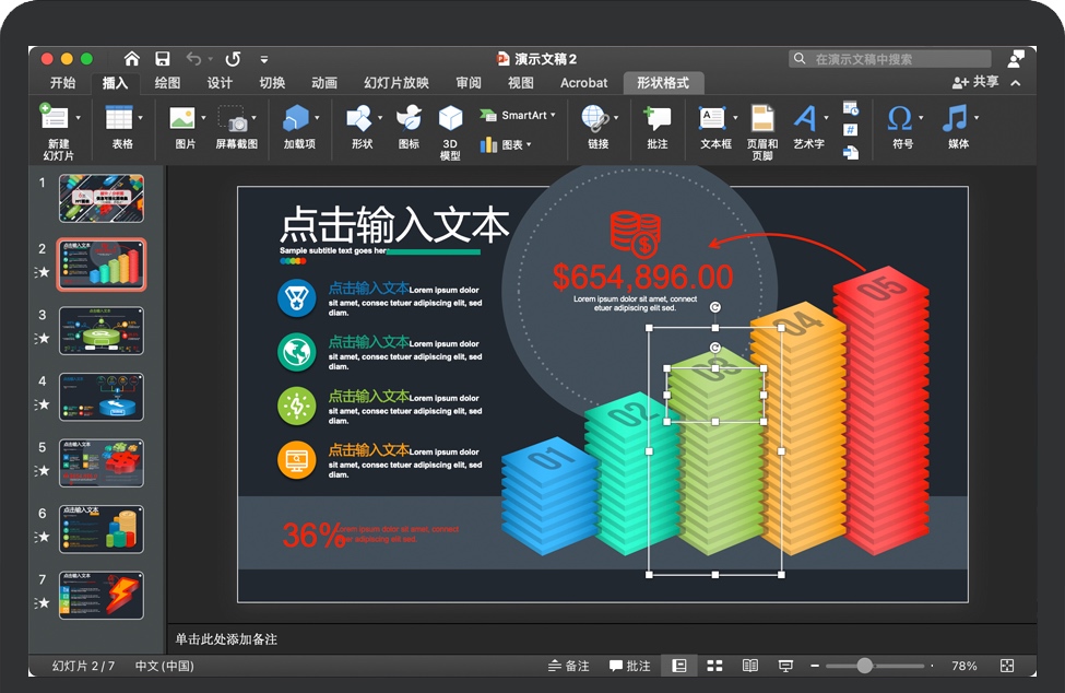 • 通过美妙的设计、丰富的动画效果、电影动态效果、3D 模型和图标呈现你的想法。