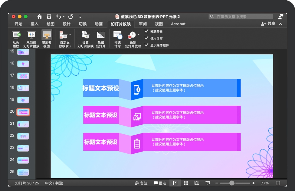 PowerPoint 2021 for Mac 是拉普拉斯网站整理的一款Mac办公必备的软件。作为知名的幻灯片演示文稿制作软件,这次的PowerPoint2021改进和新增不少功能,比如@提及功能、墨迹绘制、3D模型插入等,功能更加完善,从任何地方快速轻松地快速创建,编辑,查看,展示或分享演示文稿。PowerPoint提供了您最近文件的快速视图,以便在任何设备上轻松访问。