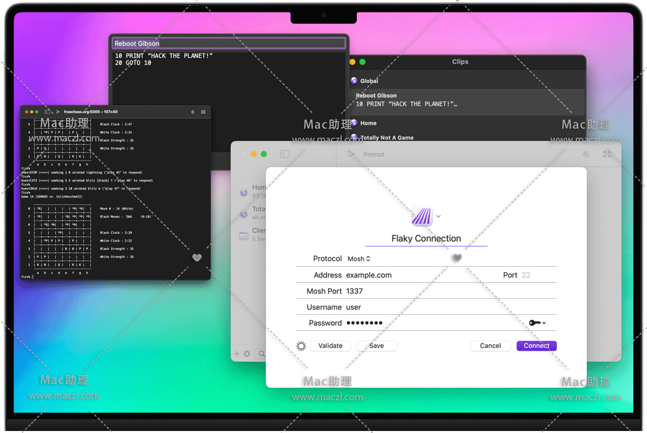 Prompt 3 for Mac 是一个终端,无论你是在路上还是在办公桌前,它都能到达你要去的地方。使用Panic for Mac,您的服务器可以在iPhone、iPad和Mac上使用。借助Mosh和Eternal Terminal的支持,即使在最不稳定的网络上,您也可以保持连接。对于Mac上的本地终端和远程连接,Prompt 是一个SSH应用程序,可以完成所有操作。