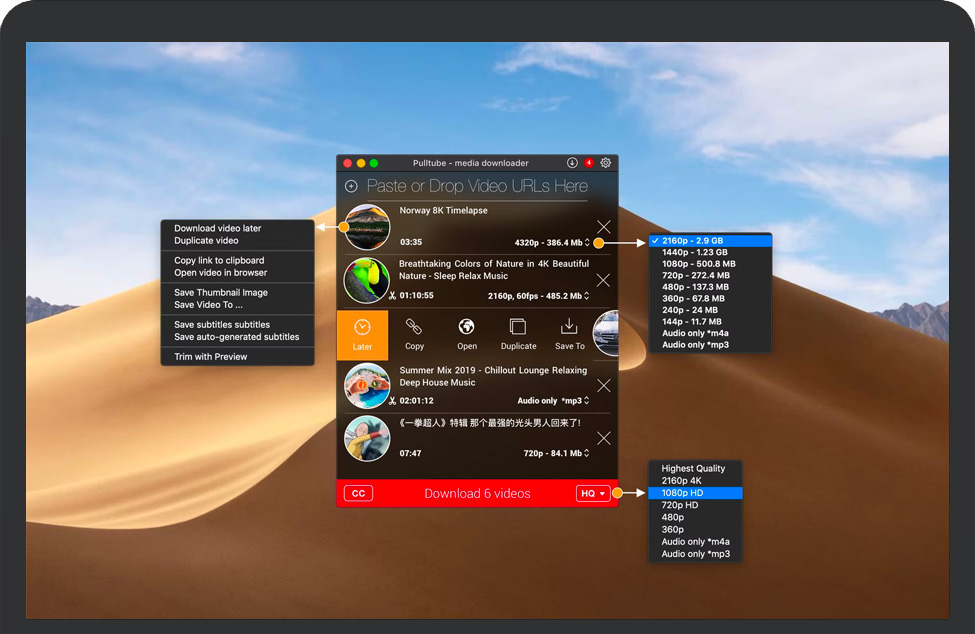 PullTube使您可以从两个来源(YouTube和Vimeo)下载视频,而稍后可能会添加其他平台。该应用程序可以处理播放列表,允许您选择输出质量,甚至可以仅提取音频。