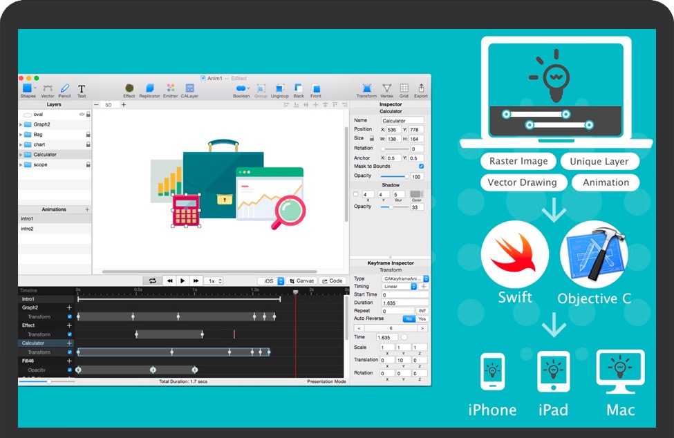 QCode是一种快速,轻巧且功能强大的动画工具,可将矢量绘图和动画转换为Objective C和Swift代码。