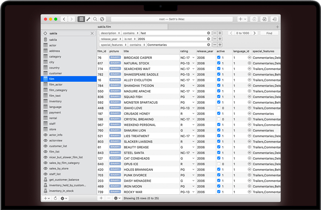 内容视图充满了方便的特性,例如灵活的多条件过滤器、简单的多行值赋值、行复制、复制到剪贴板以及通过外键跳转到相关表。
