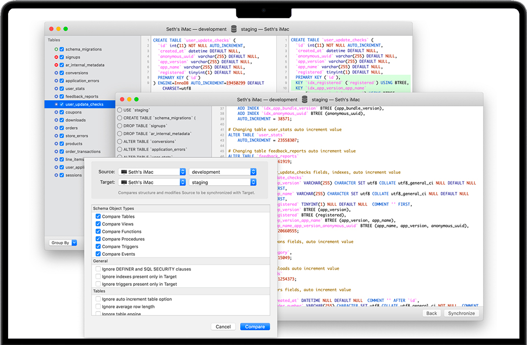 在处理不断变化的数据库结构时,有时开发和生产环境可能会分开。通过Querious中的数据库结构比较,您可以比较两个数据库,找出它们之间的所有差异,甚至采取必要的更改使它们相同。