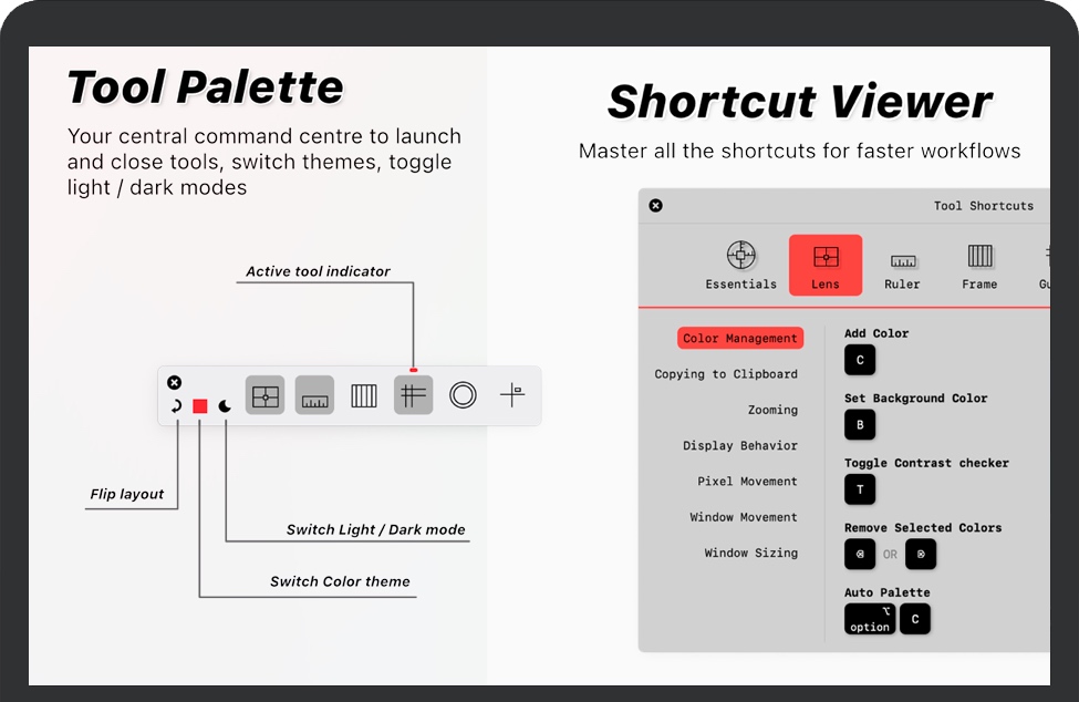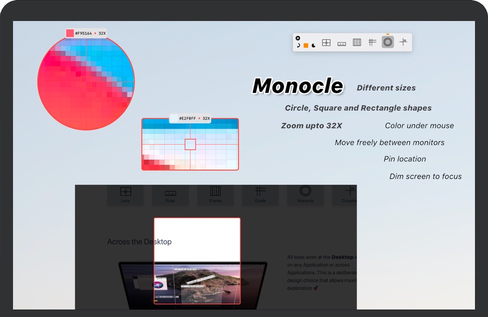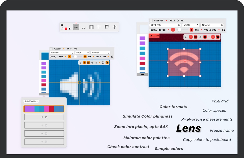 QuickLens for Mac 是Mac助理整理的一款非常专业的UI设计开发软件,作为UI设计/开发人员,你总是试图创造最好的接口,让您确保您的实现匹配设计!QuickLens Mac版为用户提供了一套工具,可实现放大像素、测量尺寸、样本颜色、检查校准等操作以及更多其他功能。