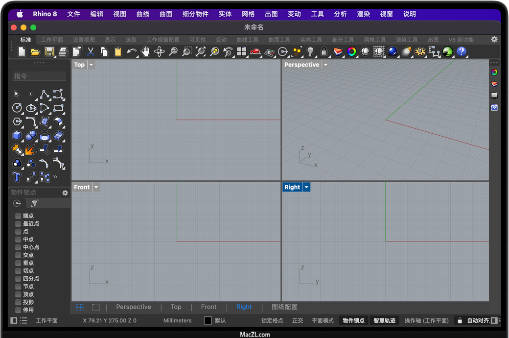 Rhino 8 for Mac 的运行速度比以往任何时候都更快,可以在 Apple Silicon 和 Intel Mac 上本地运行,并使用了 Apple Metal 显示技术。Rhino 8 for Mac还更新了 Mac 版本的用户界面,使其更加接近 Windows 版本的界面布局。Rhino 8 for Mac 在 Intel 和 Apple Silicon Macs 上比之前的速度更快。借助Metal技术,Rhino 8全新的显示管道可为高帧速率和高分辨率图形提供硬件加速的图形渲染能力。
