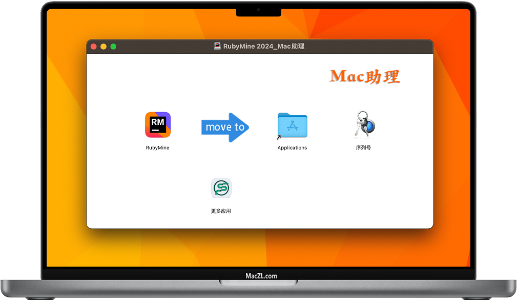 RubyMine 2024下载完成后,打开软件包如上图,请参照JetBrains Mac 全家桶激活及汉化教程进行安装即可。