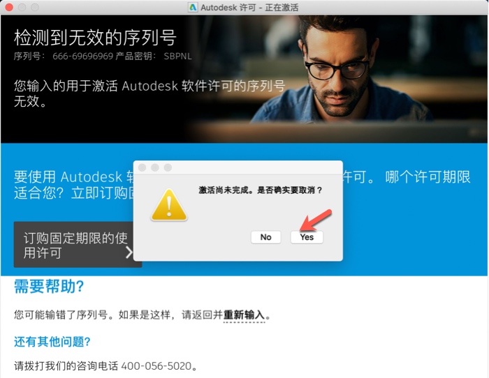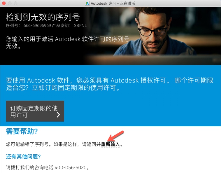 7. 稍等一会,出现“检测到无效的序列号”提示,如下图,我们点击下面的“重新输入”几个字的按扭。