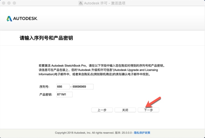 6. 如下图,提示输入序列号和产品秘钥。序列号用666-69696969,产品密钥本871M1来就有。如下图,点击下一步。
