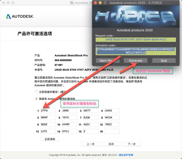 如下图,选择软件激活界面上的 “申请号” ,选中后用快捷键command+c拷贝(只能使用快捷键Command+C复制)。然后用鼠标右键的粘贴到注册机上的 “Request code:” 框里(这里的粘贴只能用鼠标右键,快捷键用不了)!