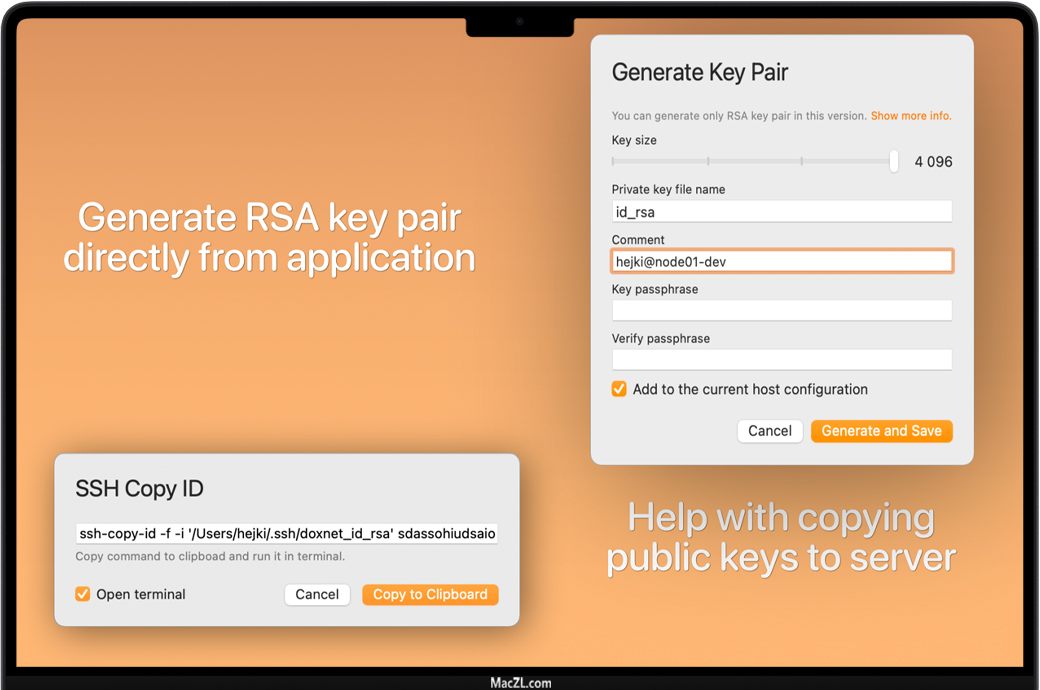 通过生成唯一的公钥或私钥 RSA 密钥对来确保访问安全。只需单击“身份”旁边的密钥图标,选择大小,创建并验证密码,然后快速保存密钥对。您还可以选择自动将密钥对复制到当前主机。