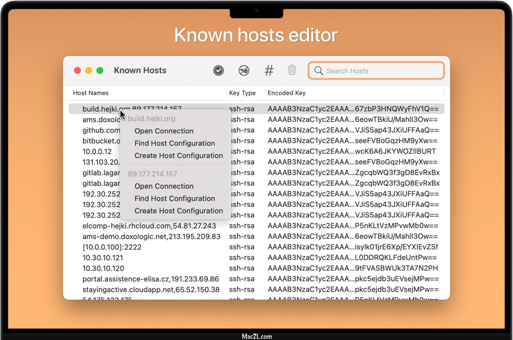 您可以在应用程序的搜索中浏览所有主机条目,包括加密的一次。编辑或自定义撤销状态,删除或评论无效主机——SSH 配置编辑器为您提供轻松管理已知主机文件所需的所有权限。
