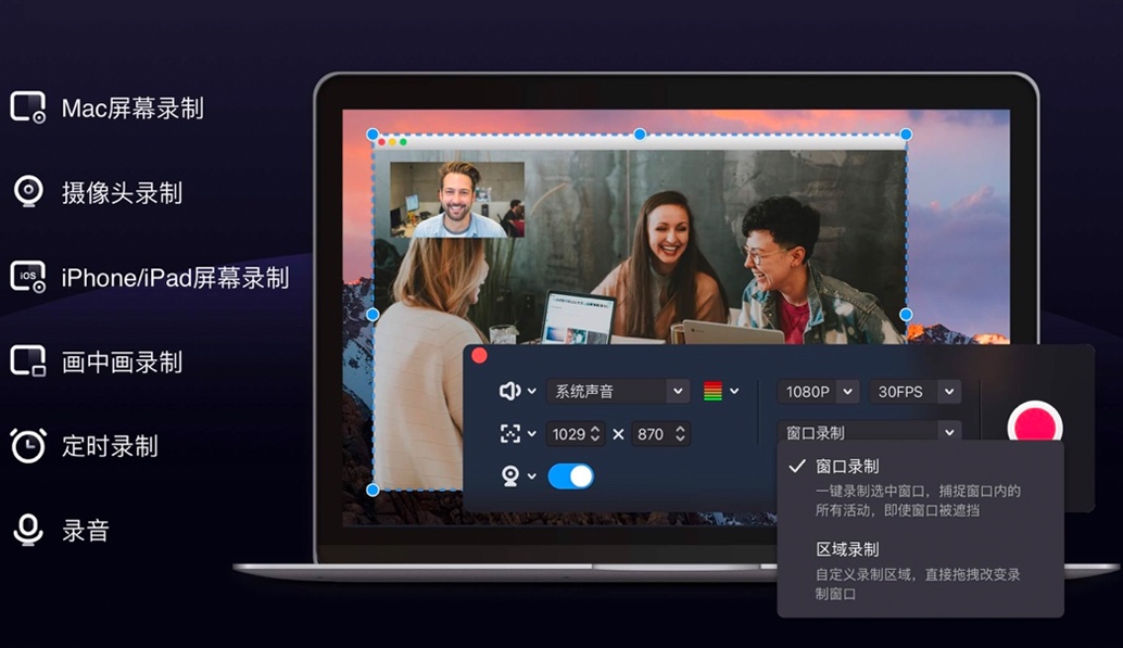 -画中画模式让您录制屏幕的同时使用摄像头录制,支持选择外接摄像头设备,轻松录制教学演示、在线会议、游戏过程、网络直播、视频聊天等。