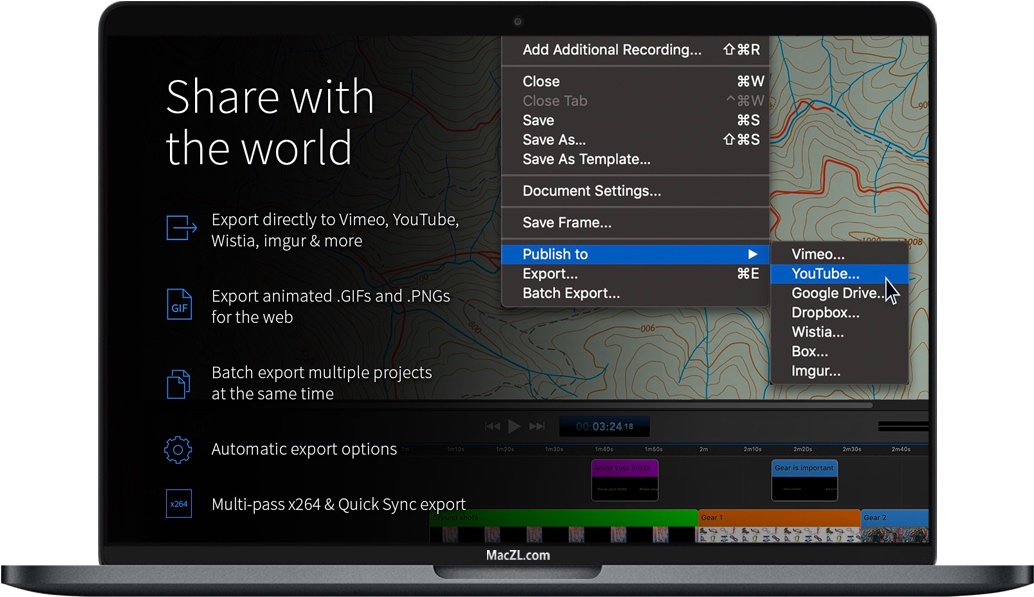 完成后,使用内置共享将视频直接发布到Vimeo,YouTube,Wistia,Google云端硬盘,Dropbox,Box或Imgur。您还可以将动画GIF或APNG,ProRes文件或MP4直接导出到桌面以在任何地方使用。