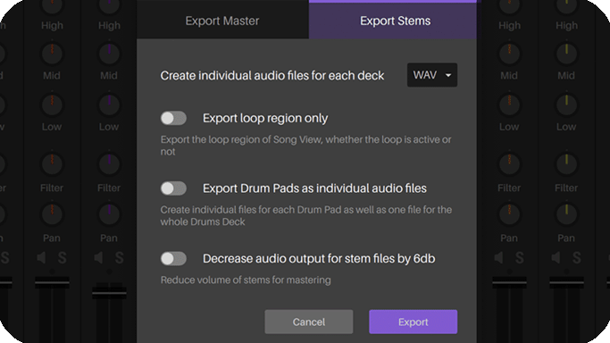 ![]() 出口项目茎将每个音轨、混音、循环或单个鼓垫导出为单独的音频文件。 |