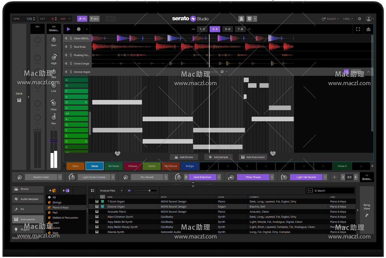 使用Serato Studio for Mac强大的步进音序器生成强劲的鼓声,并可设置摇摆、力度、网格,每个鼓采样还配有专用的钢琴卷帘。