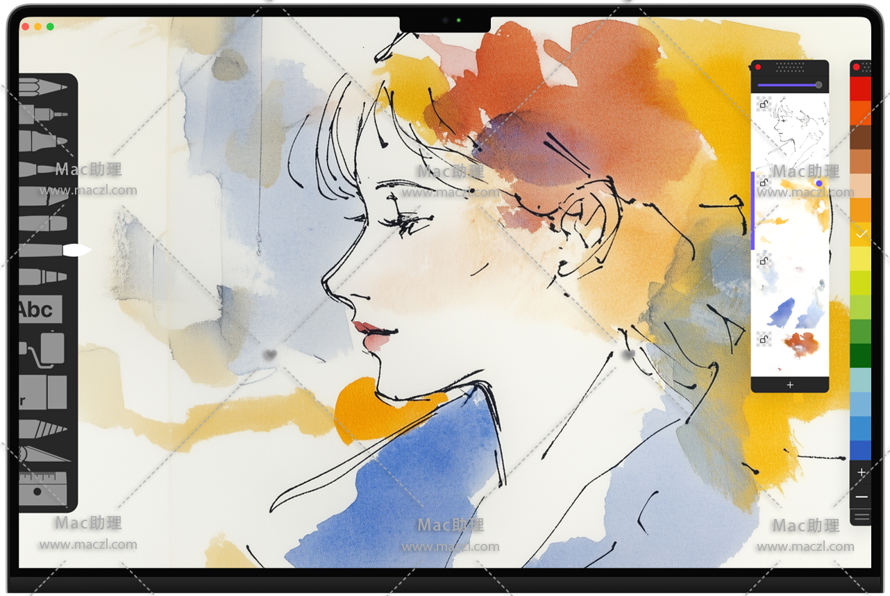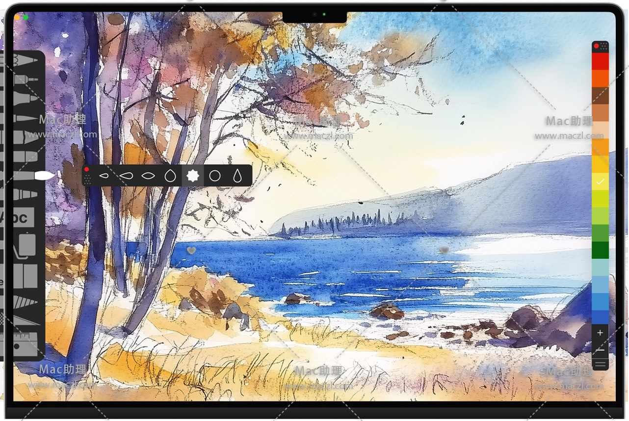 逼真的水彩笔刷: 享受干湿两种水彩笔刷,它们的表现与真实的水彩笔无异,能自然地混合和延展。
