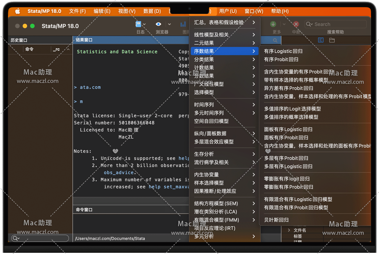 Stata for Mac 是一款完整的数据分析,数据管理和绘制专业图表的统计软件。它提供了一整套工具给使用者数据分析、数据管理以及绘制专业图表的完整及整合性统计软件。它提供许许多多功能,包含线性混合模型、均衡重复反复及多项式普罗比模式。