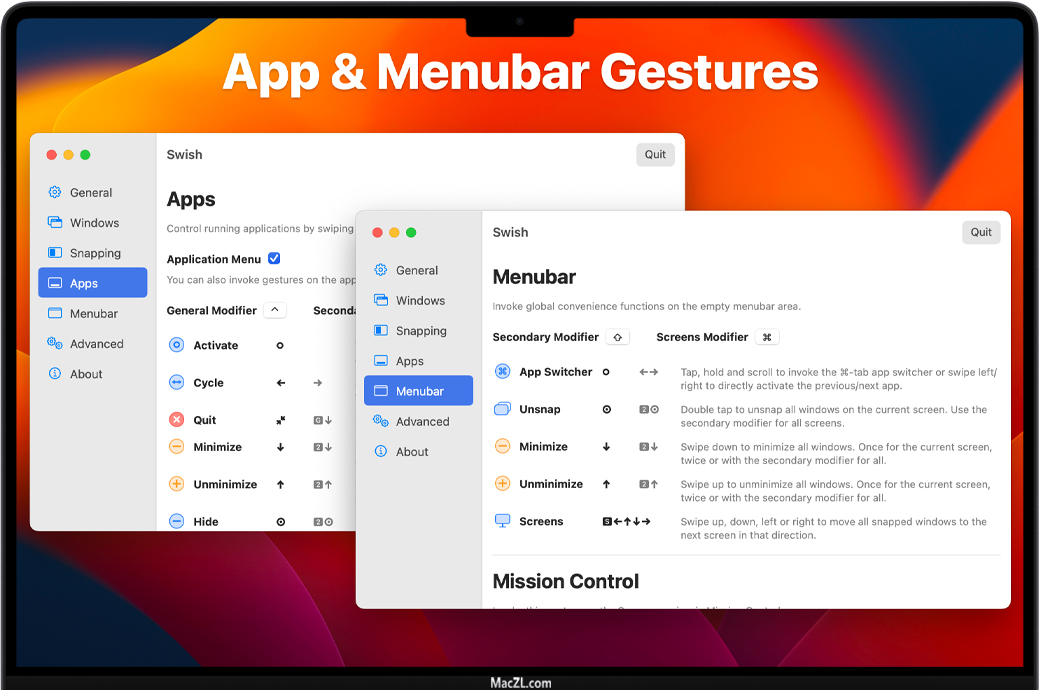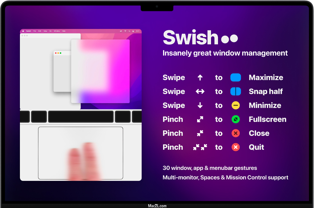 Swish 提供了 28 种直观的手势,可以增强您的工作流程并使您成为触控板高级用户。捏合退出,向下滑动以最小化,捏合进入全屏,双击隐藏等等。没有更多的点击和按钮——你用简单的动作处理一切。