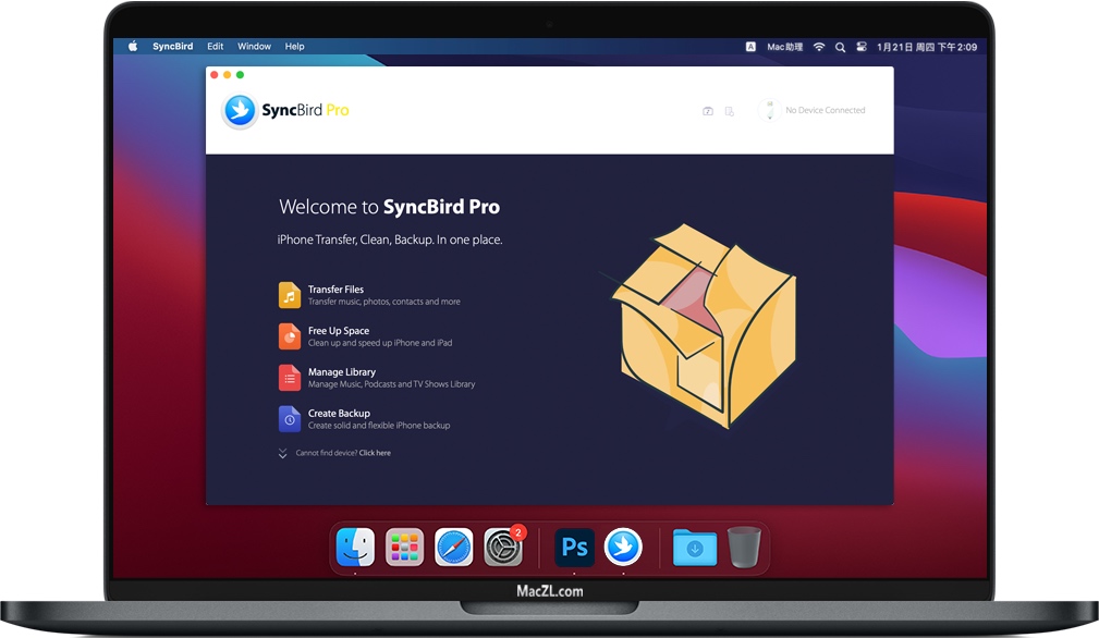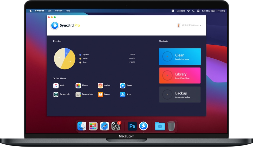 SyncBird Pro for Mac 是苹果电脑上一个简单易用但是功能强大的iPhone文件管理器,SyncBird Pro可以让iOS同步和iTunes一目了然。不使用iTunes,在iPhone、iPad、iPod和Mac之间传输音乐、播放列表、照片、视频、书籍所有的东西。而且SyncBird的独家功能名为PhoneCare和TunesCleaning,可以帮助您在iPhone和iTunes上重新获得更多的免费空间。
