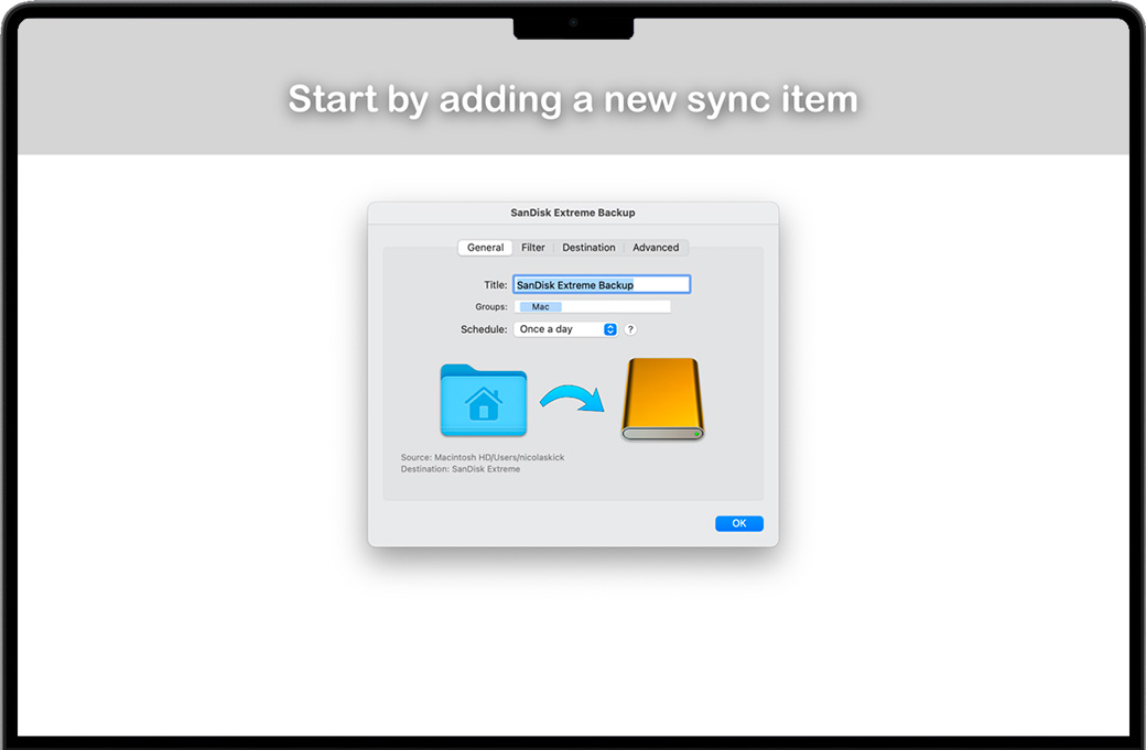 SyncTime for Mac 是同步文件的最简单解决方案。同步项主要由两个文件夹组成:源文件夹和目标文件夹。您可以选择在macOS Finder中可访问的任意两个文件夹:它们可以位于您的 Mac、外部驱动器(如USB记忆棒)上,甚至位于远程服务器上。您可以根据需要创建任意数量的同步项目,并单独自定义每个项目。尽管SyncTime为您提供了细粒度的控制,但您不必成为专家用户即可创建同步项目:只需单击+按钮,为其命名,选择源目录和目标目录,然后按播放! 安装教程