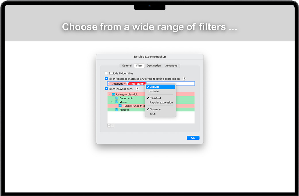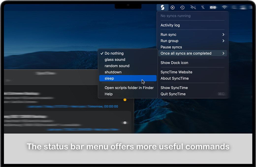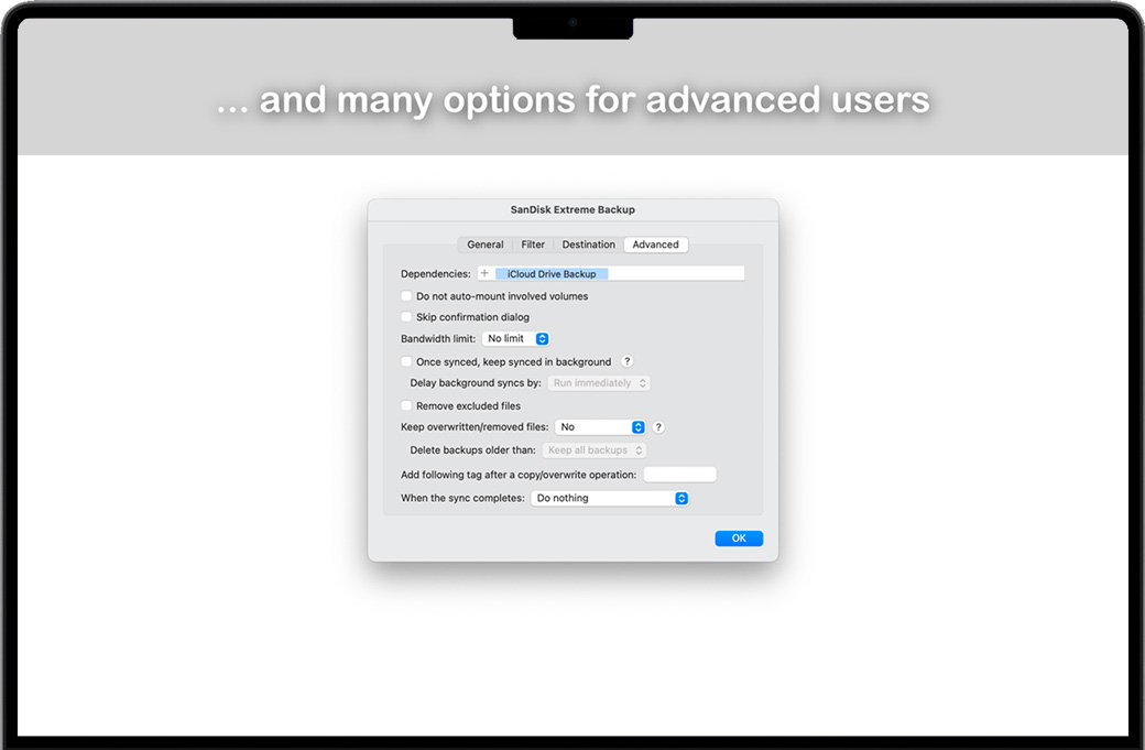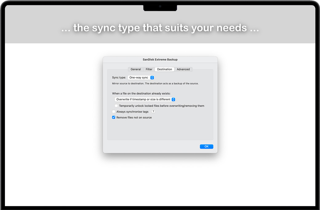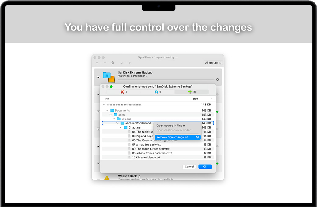 默认情况下,SyncTime 会显示您运行的每个同步将应用哪些更改。您可以浏览文件列表,删除您希望跳过的条目并快速查看任何文件。 现在您可以坐下来等待同步完成……或者在另一个同步项目仍在运行时添加一个新的同步项目。没错,每个同步项彼此独立运行。发生错误时,受影响的同步仍将尝试完成:您可以分别查看每个同步项的错误。 可以随时更改每个同步项目的设置。您可以 排除文件,这意味着默认情况下它们不会被复制;并且您可以在排除的目录中再次包含文件。您可以排除包含特定单词或匹配正则表达式的文件。 您可以选择 三种同步类型:单向同步(默认)、双向同步(允许您合并源和目标)和单向移动(在成功传输到目标后删除源文件) . 您可以决定如何处理已存在于目标上的文件,以及是否应该删除不再存在于源上或被排除在外的文件。默认情况下,仅当源文件比目标文件新时才会覆盖文件,并且不会删除任何文件。 SyncTime有很多功能,但使用起来很简单。从手动、定时或完全自动同步,到后台同步、双向同步和复杂的过滤器,您将能够完全按照想象的方式设置同步。 还有其他选项可让您进一步自定义同步项目。每个同步项都可以具有自动触发的依赖项:同步项一旦完成就会继续。运行同步后,您可以继续 在后台查看源,以便目标是最新的,直到您退出 SyncTime。如果您想保留文档的旧版本,可以选择将它们丢弃而不是覆盖或删除它们,或者将它们移动到自定义备份文件夹,以便以后恢复它们。 您可以根据需要创建任意多个同步项目,并单独自定义每个项目。在标准配置中,同步项由两个文件夹组成:源文件夹和目标文件夹。您可以选择在Finder中可以访问的任意两个文件夹:它们可以位于Mac电脑上、外部驱动器(如U盘)上,甚至可以位于远程服务器上。在可能的选项中,您会发现: •选择多个来源和目的地:所有来源将被虚拟合并并复制到每个目的地 •四种覆盖策略: