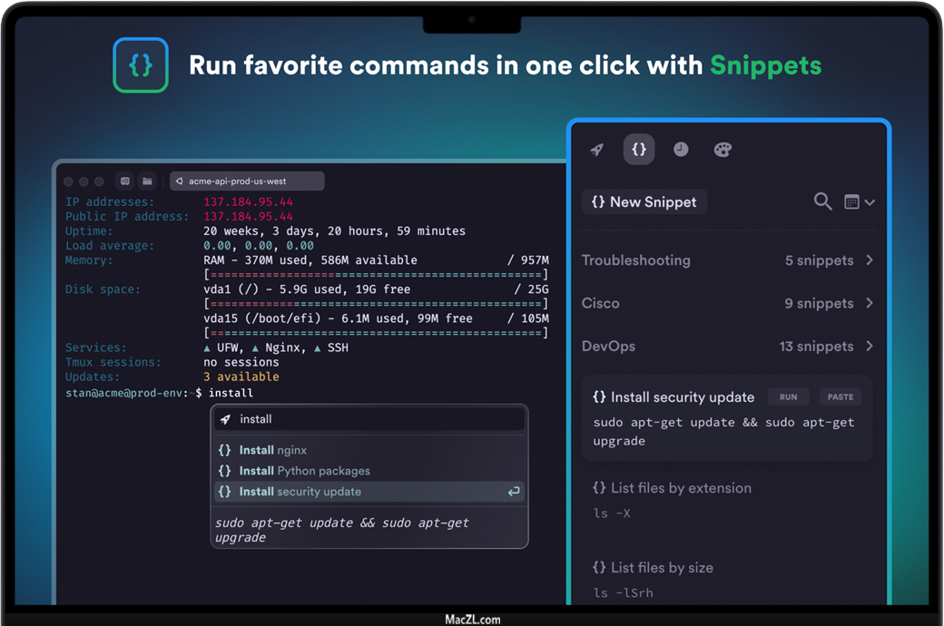 将您常用的 shell 脚本保存为代码片段。在多个目标上运行它们,或立即在终端中自动完成它们。