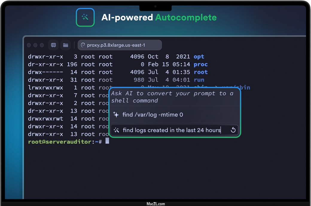 只需输入命令描述,我们的自动完成功能就会将其转换为 bash 命令。轻松、高效,随时提升您的终端体验!