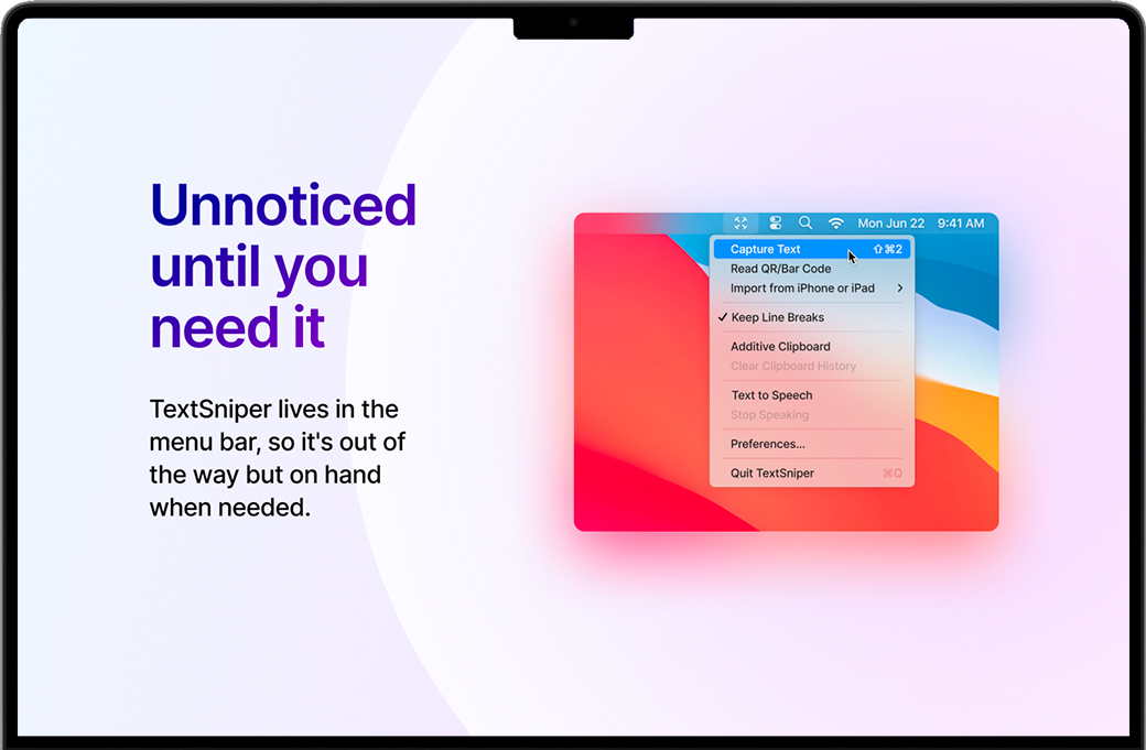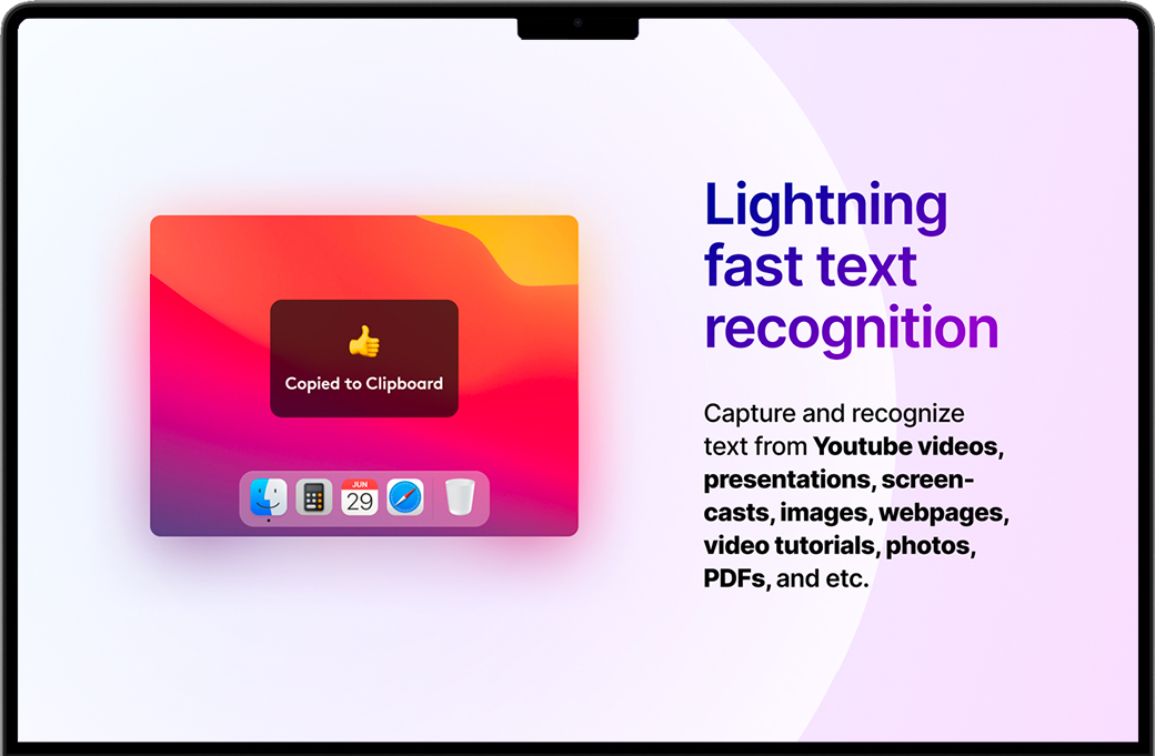 TextSniper for Mac使用直观,可以轻松地从图像,扫描的纸质文档,PDF甚至视频中提取文本。无需培训或特殊技能,非常适合家庭和企业Mac用户。只要需要,就可以从菜单栏中轻松访问它,并且具有简单的用户界面。