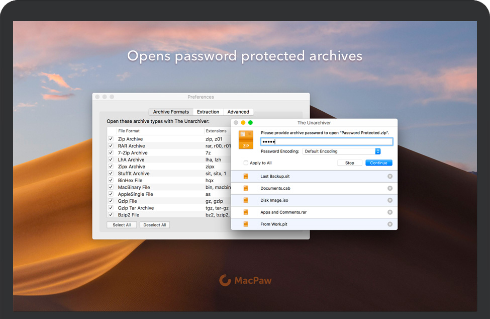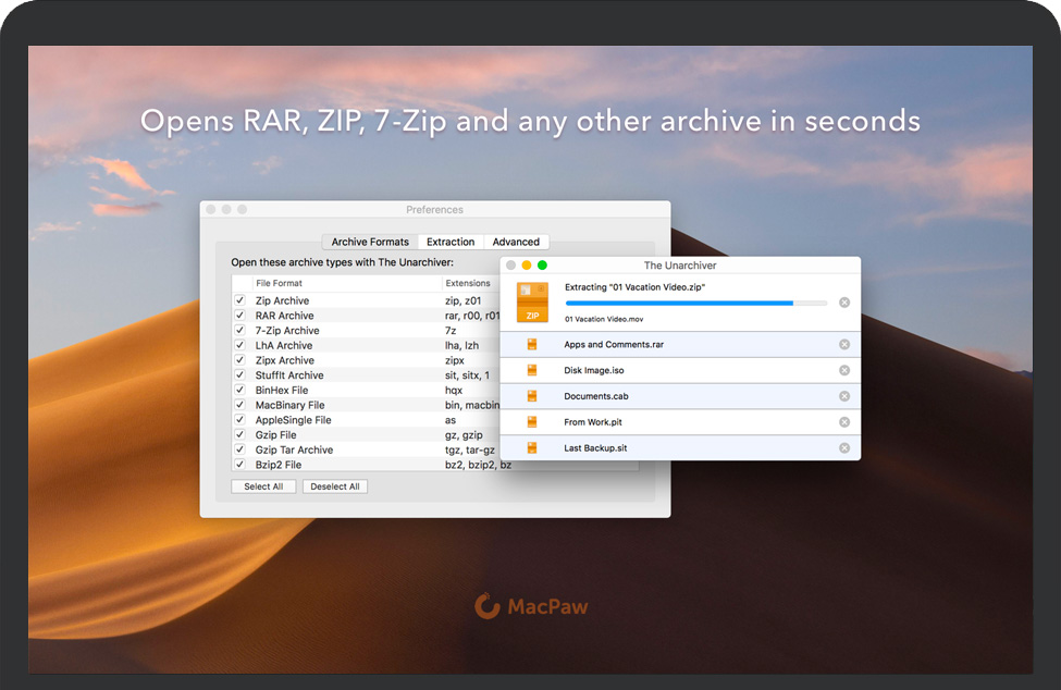 使用Unarchiver,您可以从以下存档格式中提取文件